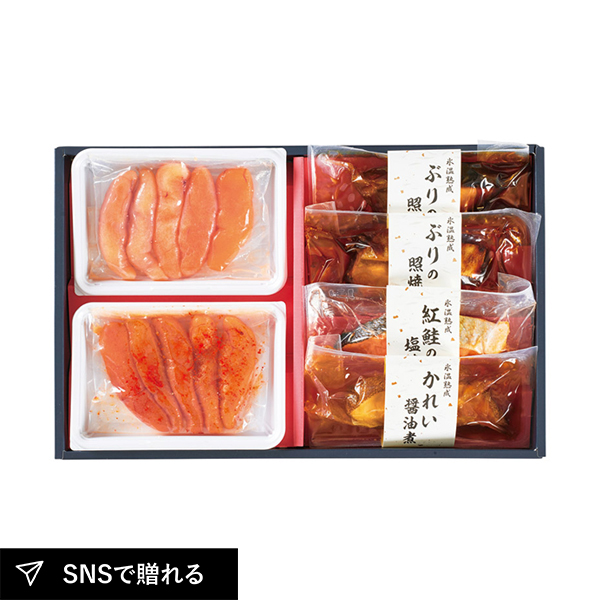 | 辛子明太子(150g)・あごだしうまみたらこ(150g)・かれい醤油煮(100g)・紅鮭塩焼き(60g)×各1、ぶりの照焼き(90g)×2 |