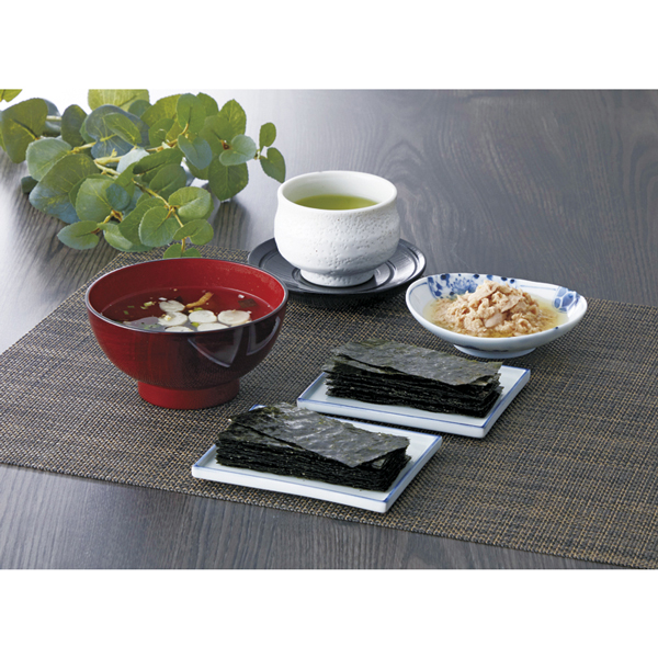 | 永井海苔 味付海苔(8切6枚×2)×2、永井海苔 お吸い物(松茸風味)(3.3g×2)・ライトツナフレーク油漬け70g・深蒸し茶40g×各1 |