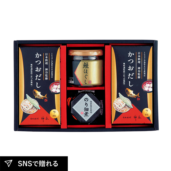 | 鮭ほぐし50g・のり佃煮80g×各1、かつおだし(4g×8)×2 |