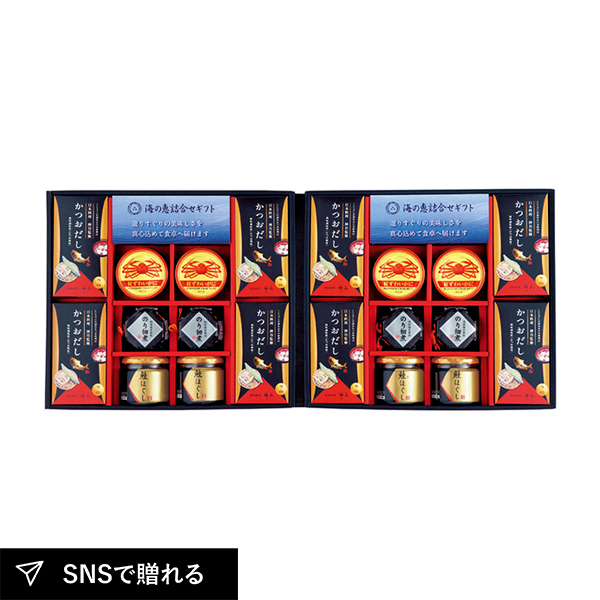 | 鮭ほぐし50g・のり佃煮80g・紅ずわいがにほぐし身55g×各4、かつおだし(4g×8)×8 |