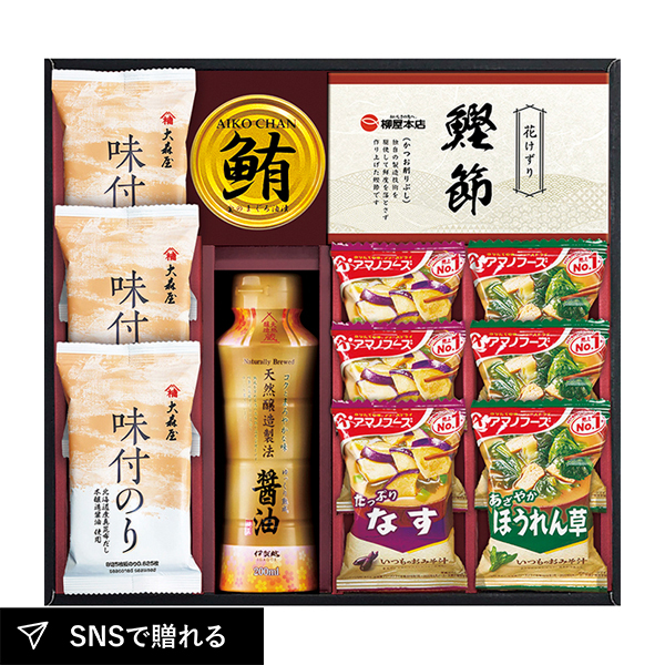 | アマノフーズいつものおみそ汁(なす・ほうれん草)・大森屋味付のり(8切5枚)×各3、天然醸造醤油200ml・柳屋本店かつおパック(3g×3)・鮪油漬フレーク70g×各1 |