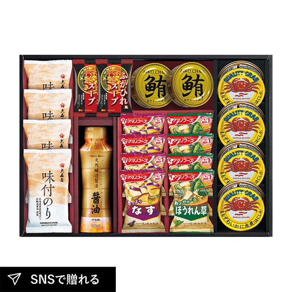 | アマノフーズいつものおみそ汁(なす・ほうれん草)・大森屋味付のり(8切5枚)・まるずわいがにほぐし身55g×各4、鮪油漬けフレーク70g・ふかひれ風スープ×各2、天然醸造醤油200ml×各1 |