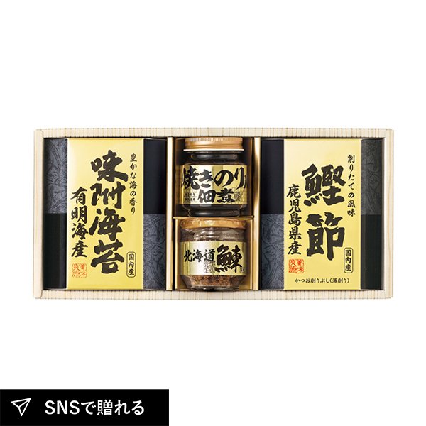 | 北海道産鰊フレーク50g・焼きのり佃煮85g・鹿児島県産鰹節(2g×3)・有明海産味附海苔(8切10枚)×各1 |