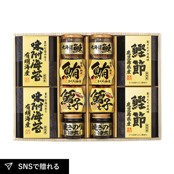 | 北海道産鰊フレーク50g・焼きのり佃煮85g・鹿児島県産鰹節(2g×3)・有明海産味附海苔(8切10枚)・まぐろ油漬け70g・鱈之子味付け70g×各2 |