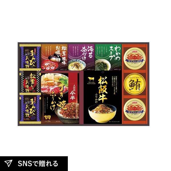| 人形町今半すき焼きふりかけ30g・松阪牛ふりかけ30g・鮪油漬フレーク70g・丸美屋のり茶漬け(6g×2)・永谷園松茸風味お吸い物(2.3g×2)・わかめスープ(3.5g×3)・松茸入りお吸い物4.2g×各1、紅ずわいがにほぐし身55g・あわび入お吸い物4g×各2 |