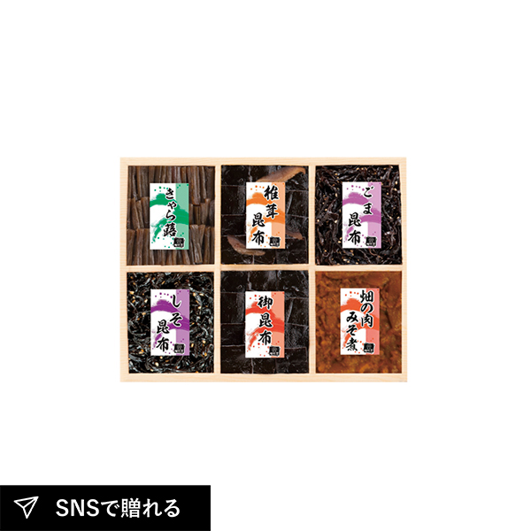 | きゃら蕗50g・椎茸昆布50g・ごま昆布60g・しそ昆布60g・御昆布50g・畑の肉みそ煮50g×各1 |