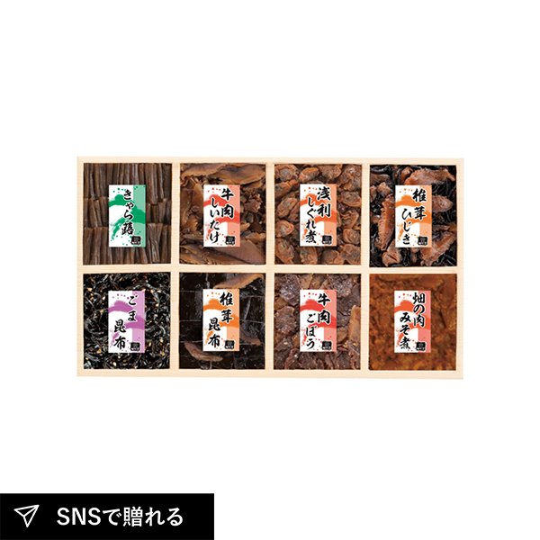 | きゃら蕗60g・牛肉しいたけ50g・浅利しぐれ煮50g・椎茸ひじき50g・ごま昆布60g・椎茸昆布60g・牛肉ごぼう50g・畑の肉みそ煮50g×各1 |