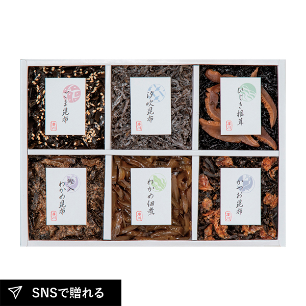 | ごま昆布45g・汐吹昆布20g・かつお昆布20g・ひじき椎茸45g・わかめ佃煮45g・鰹入わかめ昆布50g×各1 |