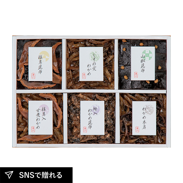 | 椎茸昆布45g・しその実わかめ45g・山椒昆布45g・椎茸入甘煮わかめ45g・鰹入わかめ昆布50g・わかめ木耳50g×各1 |