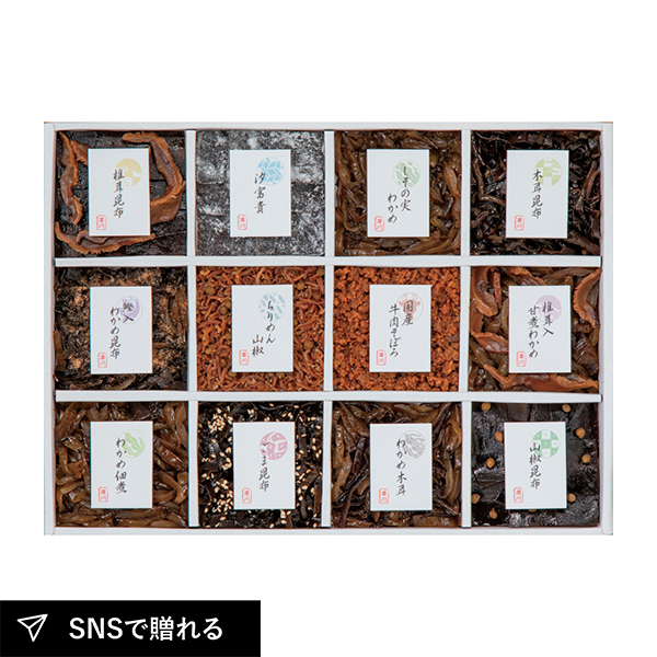 | ごま昆布70g・椎茸昆布70g・汐富貴20g・しその実わかめ70g・ちりめん山椒40g・椎茸入甘煮わかめ70g・山椒昆布60g・わかめ佃煮60g・国産牛肉そぼろ60g・鰹入わかめ昆布70g・わかめ木耳60g・木耳昆布60g×各1 |
