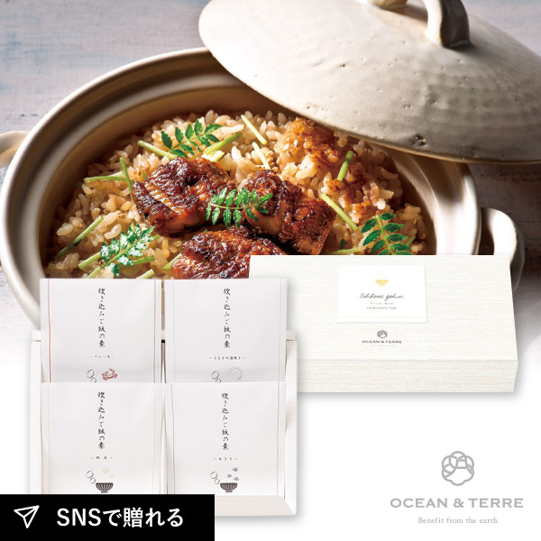 | 炊き込みご飯の素38g(2合用)×4、ずわい蟹13g×1、帆立2〜4個×1、うなぎの蒲焼き13g×1、あさり30g×1、三つ葉0.2g×4、白煎りごま1g×4 |