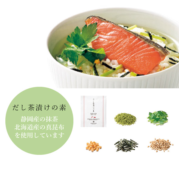 いつもの食卓を贅沢にしてくれる贈り物。北海道産真昆布を使い、静岡県産抹茶の風味を利かせただし茶漬けのセットは、家族や夫婦みんなで絶品のだし茶漬けを味わえるのはもちろん、お一人暮らしの方にも食べ比べを楽しんでいただけます。「はまぐり」「ずわい蟹」「紅鮭」「紀州南高梅」「帆立」「銀だら」の6種類の詰め合わせです。
