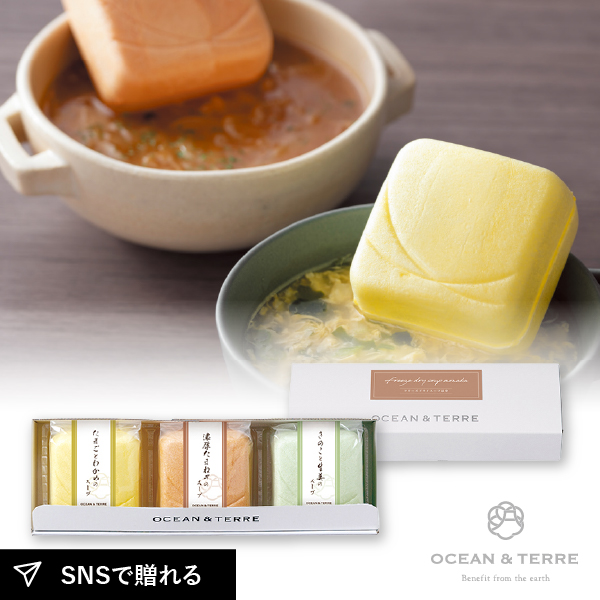 具沢山のフリーズドライスープを最中と共に。「たまごとわかめスープ」「濃厚たまねぎスープ」「きのこと生姜スープ」を最中にそれぞれ詰め込みました。最中の変わりゆく食感をお楽しみください。