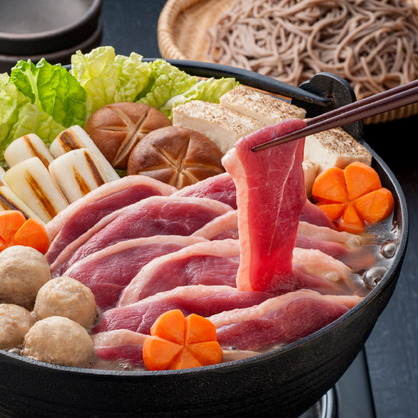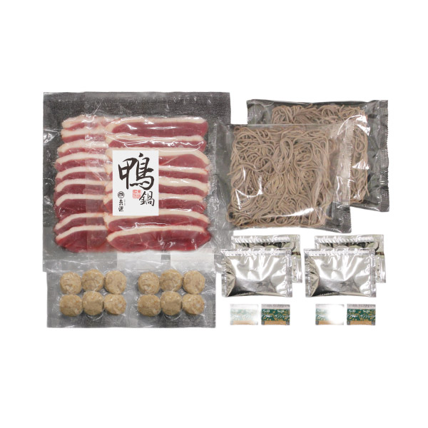| 鴨鍋セット4人前【(合鴨ロース約130g・合鴨つくね6個・五割そば200g)×各2、(鴨だし濃縮スープ30g・山椒0.2g)×各4】 |