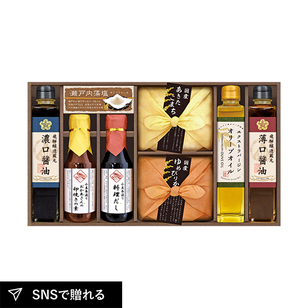 小豆島でつくる料理だしや、飛騨高山の蔵元がつくるお醤油などこだわりの調味料と、「あきたこまち」・「ゆめぴりか」のお米をセットにしました。愛される日本の食を贈るギフトは、お祝いのお返しや快気祝いなどのシーンにおすすめです。