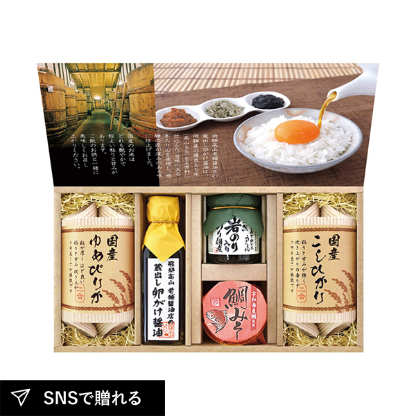 | 国産コシヒカリ(300g)・国産ゆめぴりか(300g)・飛騨高山蔵出し卵がけ醤油(120ml)・小豆島で炊いた天然岩のり入り海苔佃煮(100g)・宇和海産鯛使用鯛みそ(100g)×各1 |
