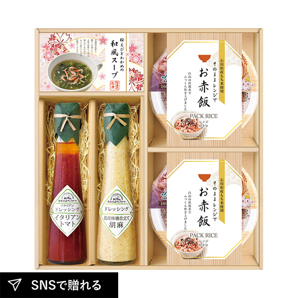 | 赤飯パック(160g)×2、信州りんご仕立て胡麻ドレッシング(120ml)・イタリアントマトドレッシング(120ml)×各1、桜えびとわかめの和風スープ(5.2g)×3 |