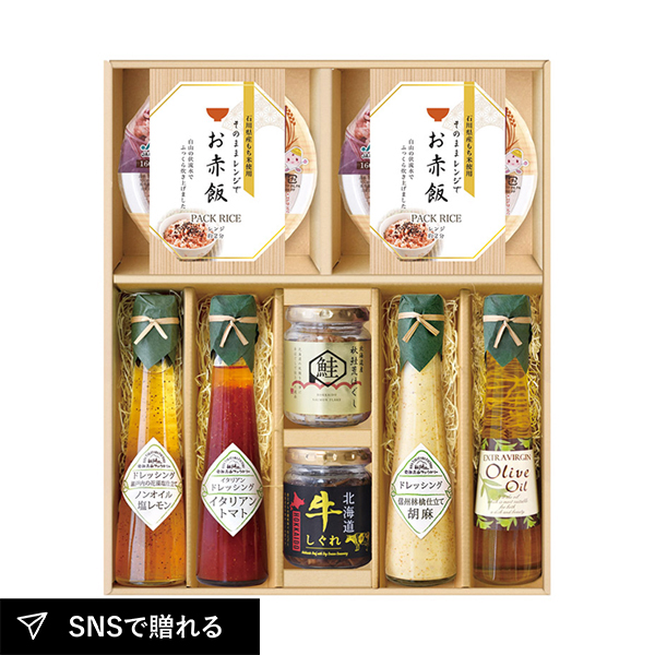 | 赤飯パック(160g)×2、信州りんご仕立て胡麻ドレッシング(120ml)・イタリアントマトドレッシング(120ml)・ノンオイル塩レモンドレッシング(120ml)・エクストラバージンオリーブオイル(110g)・北海道牛しぐれ(90g)・北海道産秋鮭荒ほぐし(70g)×各1 |