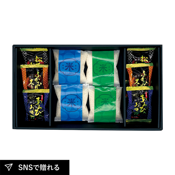 | 新潟県産コシヒカリ150g・新潟県産こしいぶき150g・松茸のお吸物4.2g・ふかひれスープ5.5g・あわび入お吸物4g×各2 |