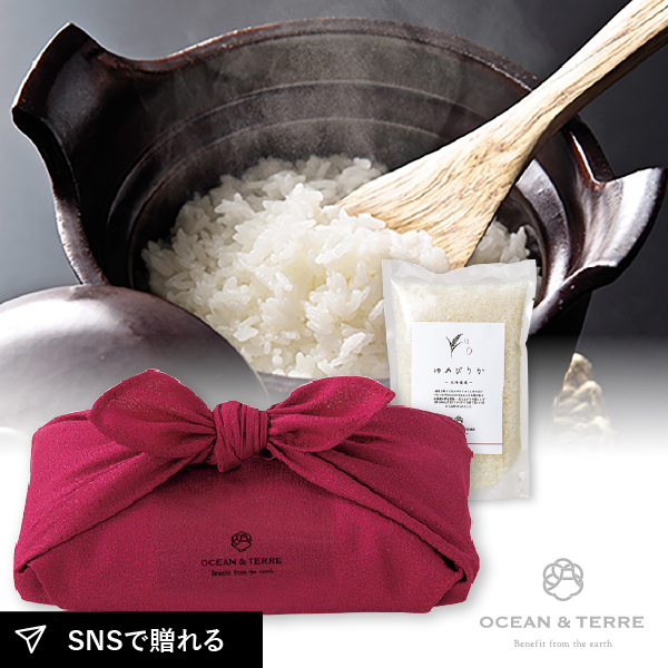 おもてなしの心で包んだ、日本人の体に深く染み渡る瑞穂の恵みの豊かで繊細な優しい風味。北海道最上級ブランド米である「北海道産 ゆめぴりか」は、粘りが強くやわらかいと言われており、品種改良を重ねてきた北海道米の技術の集大成ともいえる品種です。甘みが際立ち、濃い味わいの品種。まずは白ごはんで味わうのがおすすめです。美しい風呂敷で包まれた美味しいお米は、縁起物としてぴったりの格調高い贈り物になります。