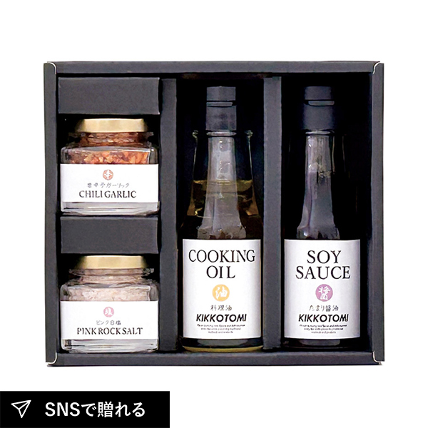 | 唐辛子ガーリック(20g)・ピンク岩塩(45g)・クッキングオイル(60g)・たまり醤油(70ml)×各1 |