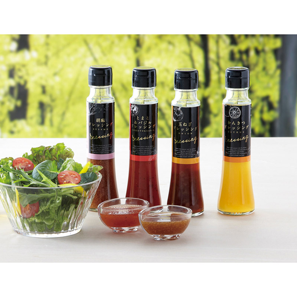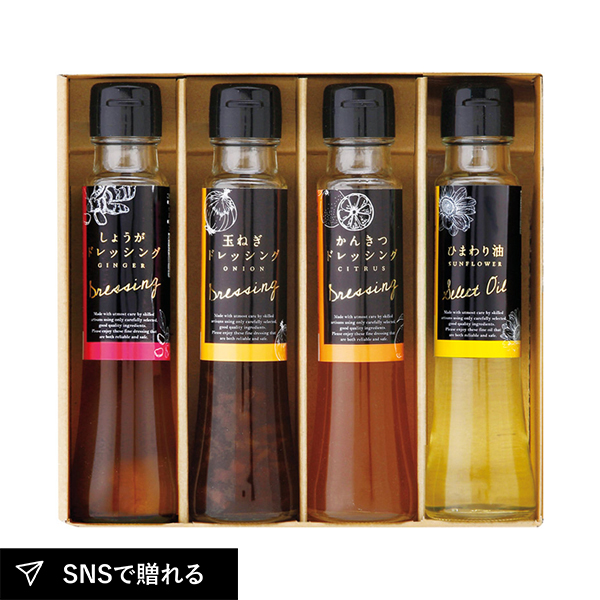 | しょうがドレッシング(100ml)・玉ねぎドレッシング(100ml)・かんきつドレッシング(100ml)・ひまわり油(90g)×各1 |