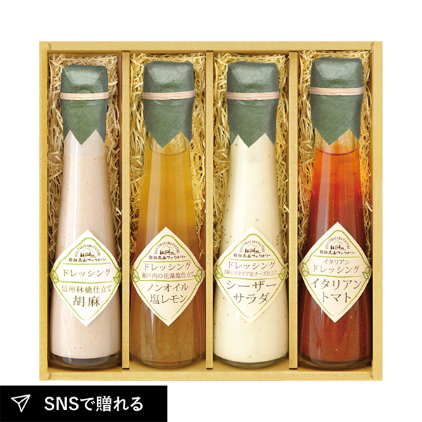 | 信州林檎仕立て胡麻ドレッシング(120ml)・2種のイタリア産チーズ仕立てシーザーサラダドレッシング(120ml)・瀬戸内の花藻塩仕立てノンオイル塩レモンドレッシング(120ml)・イタリアントマトのイタリアンドレッシング(120ml)×各1 |