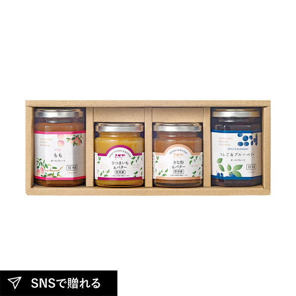 | ももスプレッド(140g)・りんご&ブルーベリースプレッド(140g)・さつまいも&バターペースト(110g)・きな粉&バターペースト(110g)×各1 |