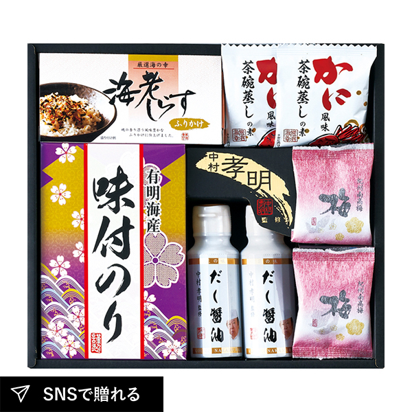 | 中村孝明監修だし醤油100ml・紀州梅干し1粒・かに風味茶碗蒸しの素(2食分)×各2、味付のり(8切8枚×2)・海老しらすふりかけ(3g×3)×各1 |