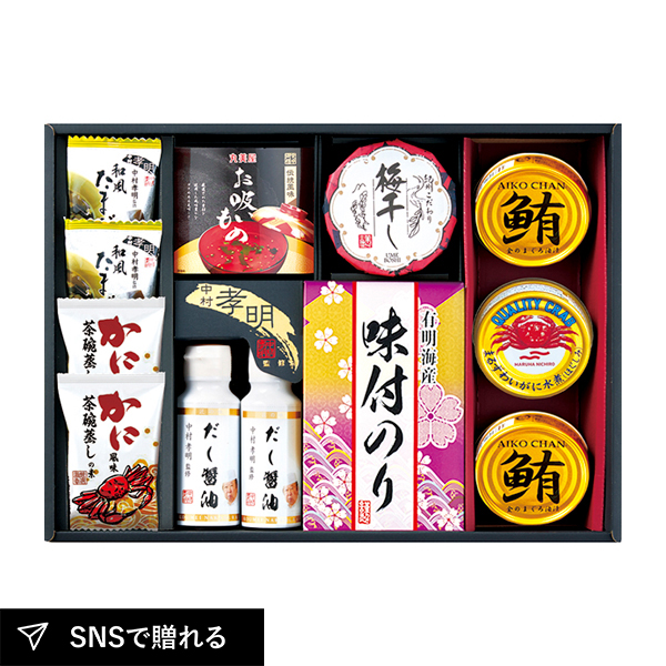 | 中村孝明監修(だし醤油100ml・たまごすーぷ)・かに風味茶碗蒸しの素(2食分)・鮪油漬フレーク70g×各2、味付のり(8切8枚×2)・お吸いもの(2.5g×5)・まるずわいがにほぐしみ55g・紀州梅干し70g×各1 |