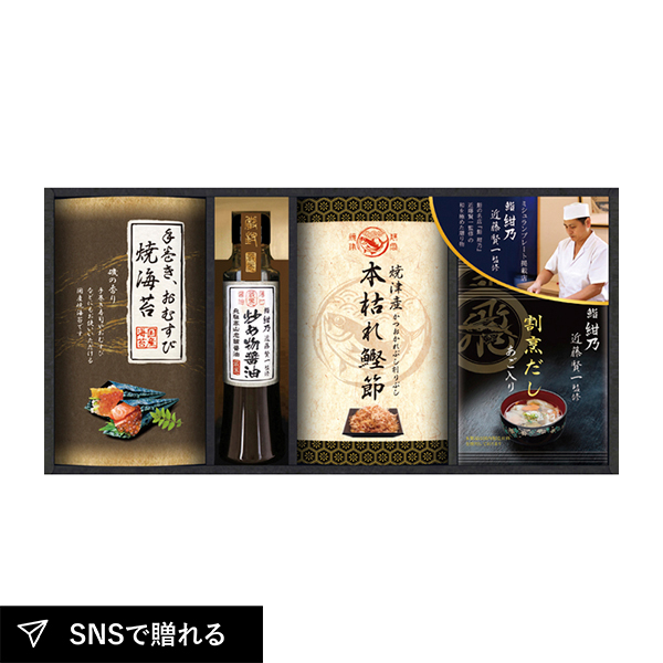 | 鮨 紺乃 近藤賢一監修 あご入り割烹だしパック8g×4、鮨 紺乃 近藤賢一監修 飛騨高山炒め物醤油200ml・焼津産 本枯れ鰹節15g・手巻き・おむすび用 焼海苔(半切5枚)×各1 |