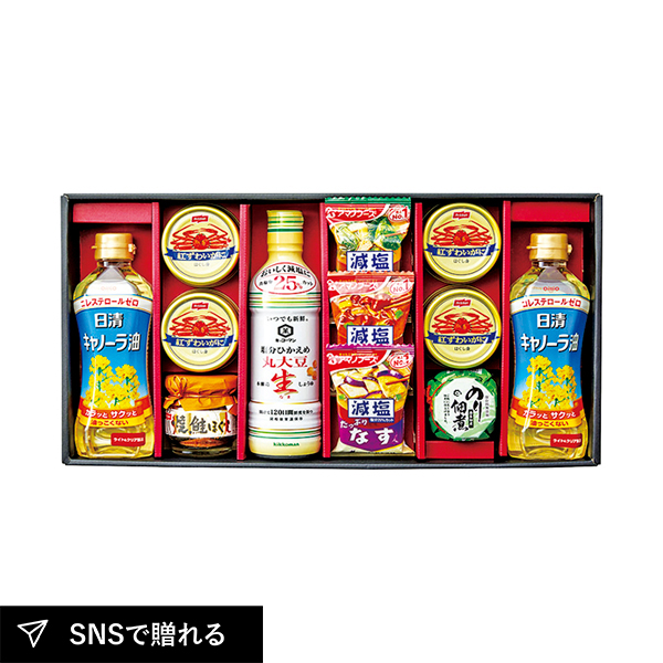 | 日清キャノーラ油350g×2、キッコーマン塩分ひかえめ丸大豆生しょうゆ450ml・アマノフーズ減塩いつものおみそ汁(なす・なめこ・ほうれん草)・ニッスイ焼鮭ほぐし50g・島の香 のり佃煮80g×各1、ニッスイ紅ずわいがにほぐし身55g×4 |
