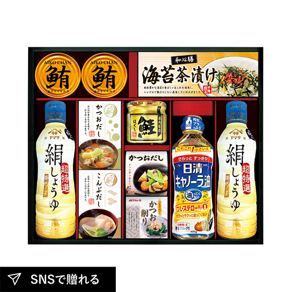 | ヤマサ絹しょうゆ450ml・まぐろ油漬け70g×各2、かね七かつおだし(4g×5)・かね七こんぶだし(4g×5)・マルトモかつおパック(0.7g×3)・シーラックかつおだし(4g×3)・鮭ほぐし50g・日清キャノーラ油400g・海苔茶漬け(6g×5)×各1 |