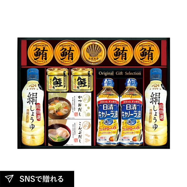| ヤマサ絹しょうゆ450ml・鮭ほぐし50g・日清キャノーラ油400g×各2、まぐろ油漬け70g×4、かね七かつおだし(4g×5)・かね七こんぶだし(4g×5)・宝幸貝柱水煮ほぐし身65g(固形量35g)×各1 |