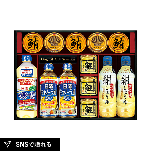 | ヤマサ絹しょうゆ450ml・日清キャノーラ油400g・宝幸貝柱水煮ほぐし身65g(固形量35g)×各2、鮭ほぐし50g・まぐろ油漬け70g×各3、日清ヘルシーオフ600g×1 |