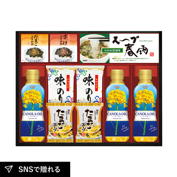 | キャノーラ油 300g×3、有明海産味付のり(8切5枚)・たまごスープ6.4g×各2、スープ春雨わかめ醤油味(14.1g×2)・ふりかけ(たまご・さけ)(2.5g×3)×各1 |