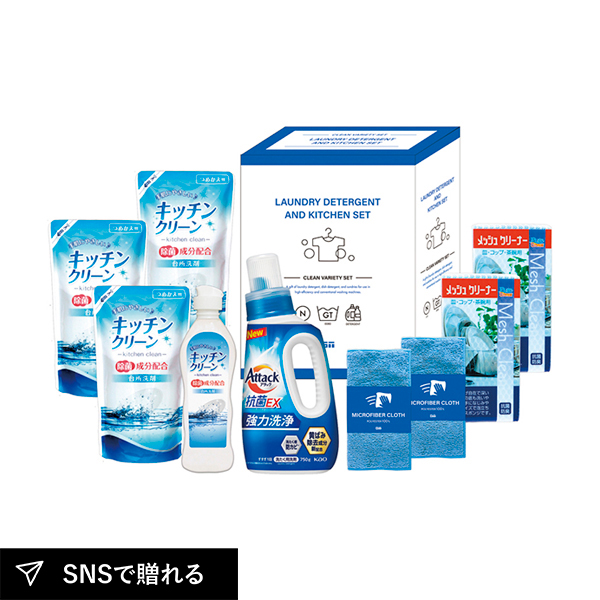 | 花王アタック抗菌EX本体750ml・キッチンクリーン250ml×各1、キッチンクリーン詰替200ml×3、メッシュクリーナー・マイクロファイバークロス:20×20cm×各2 |
