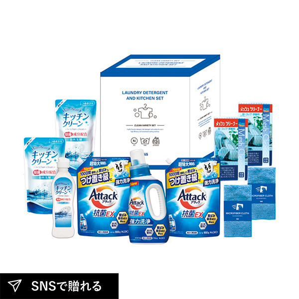 | 花王アタック抗菌EX本体750g・キッチンクリーン250ml×各1、花王アタック抗菌EX詰替900g・キッチンクリーン詰替200ml・メッシュクリーナー・マイクロファイバークロス:20×20cm×各2 |