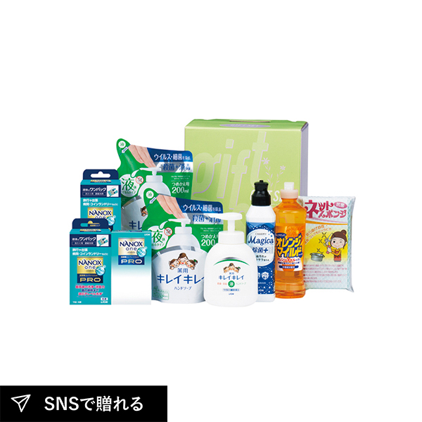 | ライオンキレイキレイ薬用液体ハンドソープ(詰替用)200ml・ライオンNANOX one PRO(10g×6袋)×各2、ライオンCHARMY Magica除菌+220ml・オレンジマイルドコンパクト270ml・ライオンキレイキレイ薬用液体ハンドソープ(本体)250ml・ライオンNANOX one PRO(10g×2袋)・ネットスポンジ1P×各1 |