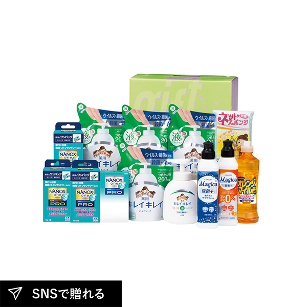 | ライオンキレイキレイ薬用液体ハンドソープ(詰替用)200ml×4、ライオンNANOX one PRO(10g×6袋)×3、ライオンCHARMY Magica除菌+220ml・ライオンCHARMY Magica酵素+オレンジの香り220ml・オレンジマイルドコンパクト270ml・ライオンキレイキレイ薬用液体ハンドソープ(本体)250ml・ライオンNANOX one PRO(10g×2袋)・ネットスポンジ1P×各1 |