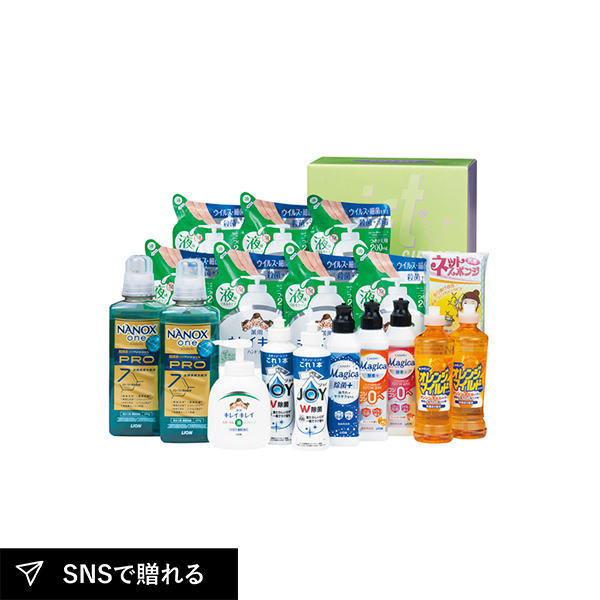 | ライオンキレイキレイ薬用液体ハンドソープ(詰替用)200ml×7、ライオンNANOX one PRO(本体)600g・P&G除菌ジョイコンパクト170ml・オレンジマイルドコンパクト270ml×各2、ライオンCHARMY Magica除菌+220ml・ライオンCHARMY Magica酵素+オレンジの香り220ml・ライオンCHARMY Magica酵素+フレッシュピーチの香り220ml・ライオンキレイキレイ薬用液体ハンドソープ(本体)250ml・ネットスポンジ1P×各1 |