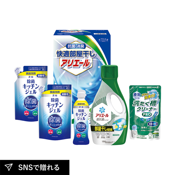 | P&Gアリエールジェル部屋干し超消臭700g・除菌キッチンジェル200ml・液体洗たく槽クリーナーPRO200g×各1、除菌キッチンジェル(詰替)160ml×2 |