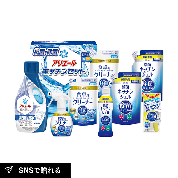 | P&Gアリエールジェル700g・除菌キッチンジェル200ml・食卓用クリーナー260ml・コンパクトスポンジ×各1、除菌キッチンジェル(詰替)160ml・食卓用クリーナー(詰替)250ml×各2 |