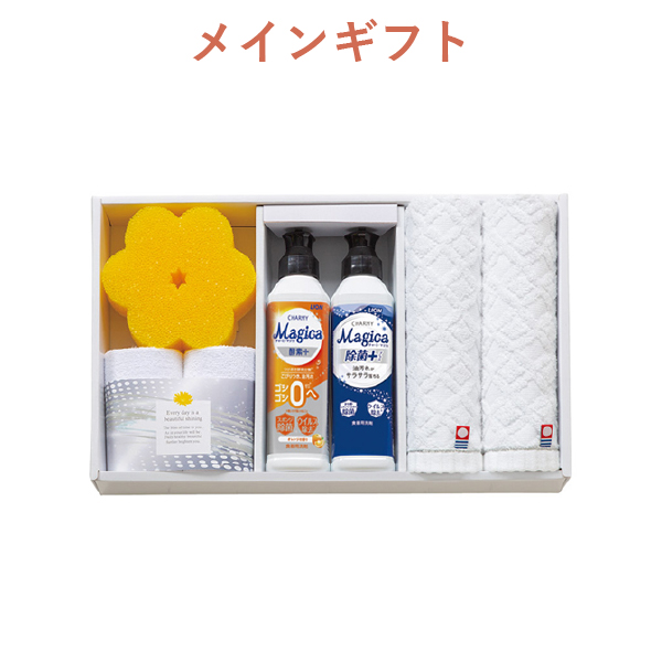 メインギフトは「クラシュシュキッチンソープギフト」です。チャーミーマジカオレンジと除菌プラスの洗剤に、タオルやクロス、スポンジを加えた、使いやすいキッチンギフトです。毎日の家事を快適に彩り、贈って喜ばれるキッチン洗剤としておすすめです。