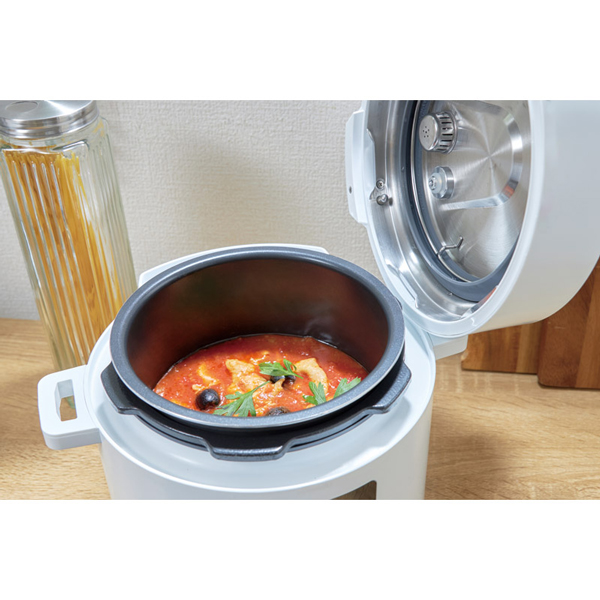 材料を入れてタイマーを設定するだけ!「ほったらかし(R)」で簡単に調理が完成。火加減や時間計測の手間がなく、付属レシピで手軽においしい料理が作れます。内鍋とふたは取り外して丸洗い可能。レシピブック2種付き。調理容量約1.2L(豆類0.6L)、最高圧力70kPa。