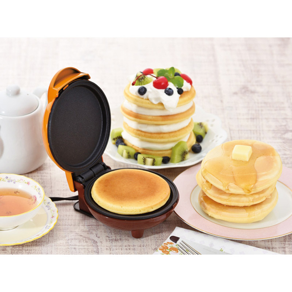 手のひらサイズのパンケーキメーカー。直径10cmのプチパンケーキが約3分で作れます。プレートはフッ素樹脂塗装でお手入れ簡単。お好み焼きやマドレーヌなども作れるかんたんレシピ付き。