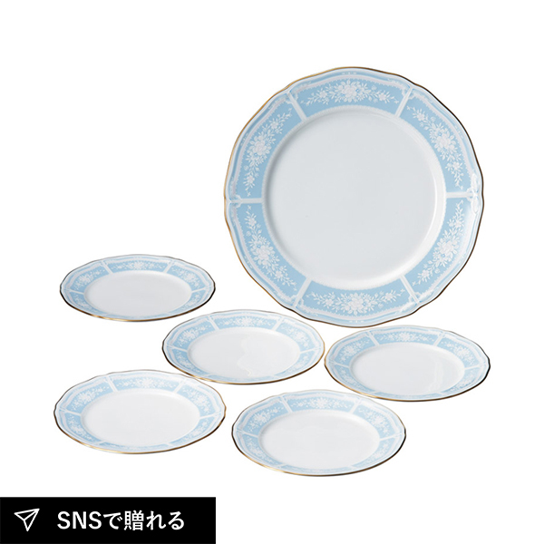 清楚なブルーと白盛りで施された繊細なレース模様がドレスのように美しく優雅な至福のスイーツタイムを演出します。カップやソーサーの縁がゴールドになっていて、高級さと上品さを感じるデザイン。
