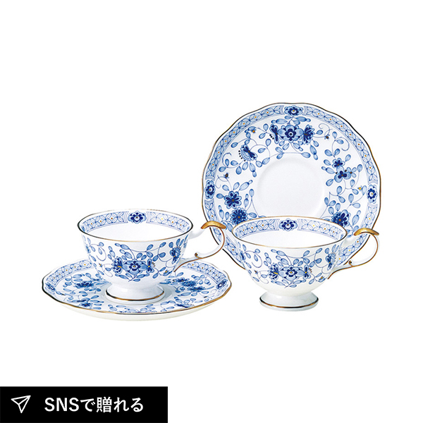 縁起の良い梅の花を藍色で描いた「ミラノ」シリーズのペアティーセット。上品なカップ&ソーサーが、特別なひとときを彩ります。日常使いにも、記念日の贈り物にも最適で、上質なティータイムを演出するギフトです。