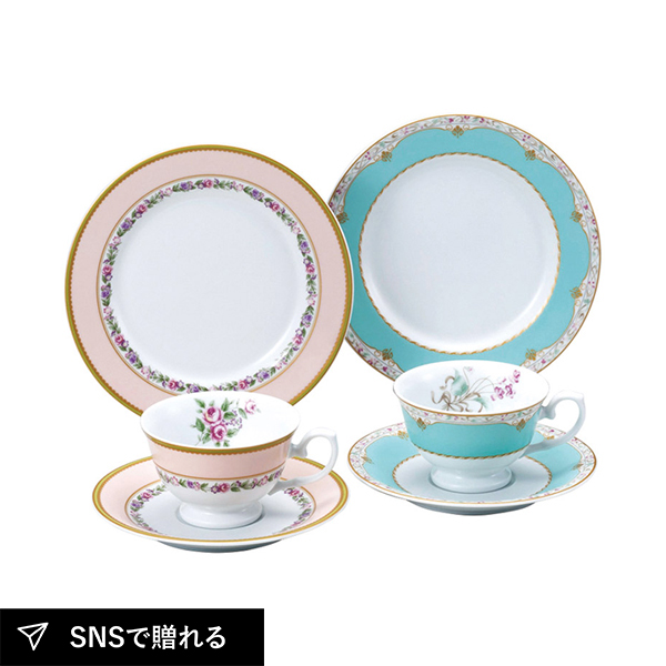 パステルカラーと上品な花柄がかわいいティーセットです。絵柄違いのカップがティータイムの話題づくりに一役かって、楽しいひとときを演出します。カップ&ソーサーには、電子レンジ対応の金彩をほどこしているので使い勝手がいいのもポイントです。