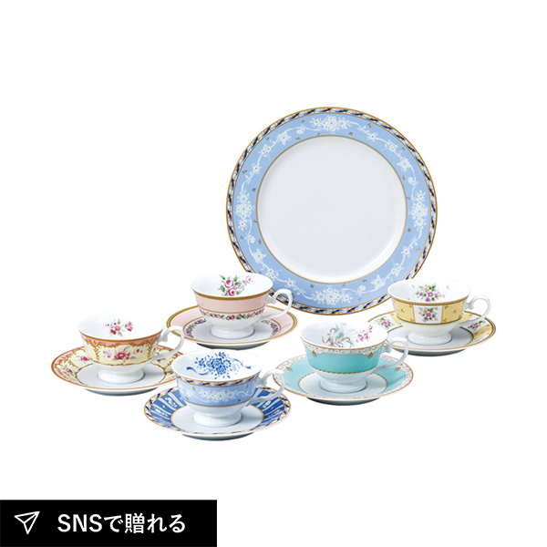 パステルカラーと上品な花柄がかわいいティーセットです。絵柄違いのカップがティータイムの話題づくりに一役かって、楽しいひとときを演出します。カップ&ソーサーには、電子レンジ対応の金彩をほどこしているので使い勝手がいいのもポイントです。